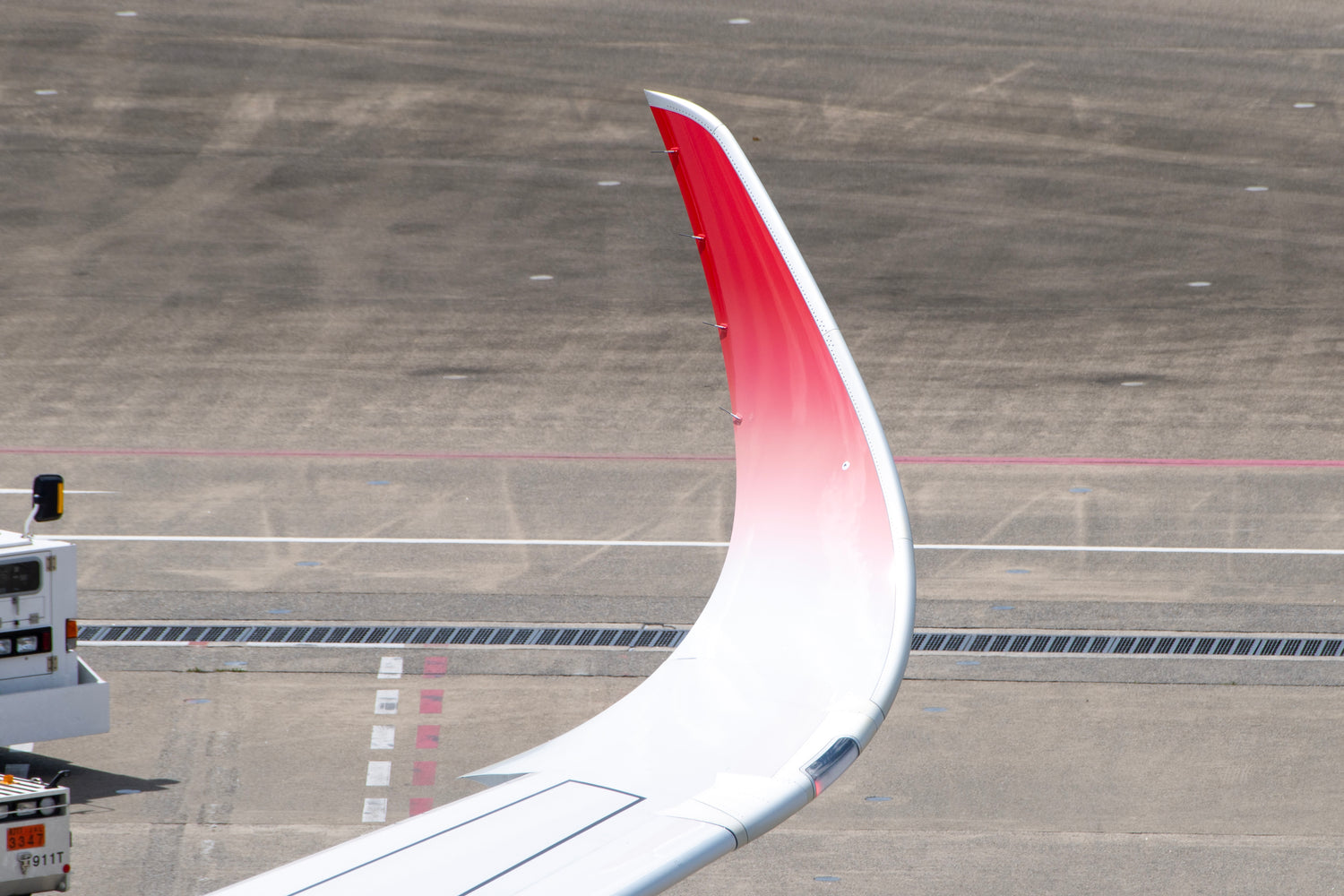 航空機の主翼端に装着される小さな翼端板『ウイングレット』。これにより飛行中に主翼先端部から発生する翼端渦という空気の渦を減少させ、空気の抵抗を抑えることで、燃費を向上させる効果があります。形状はメーカーや機種によってさまざま、また名称もウイングレット、シャークレットなど異なります。さて、写真のすっと伸びやかで美しいウイングレットはエアバスA350-900のモノ。近年では海外の航空会社に加えて、JALが国内線に導入しており、羽田でもすっかりお馴染みの存在となりました。