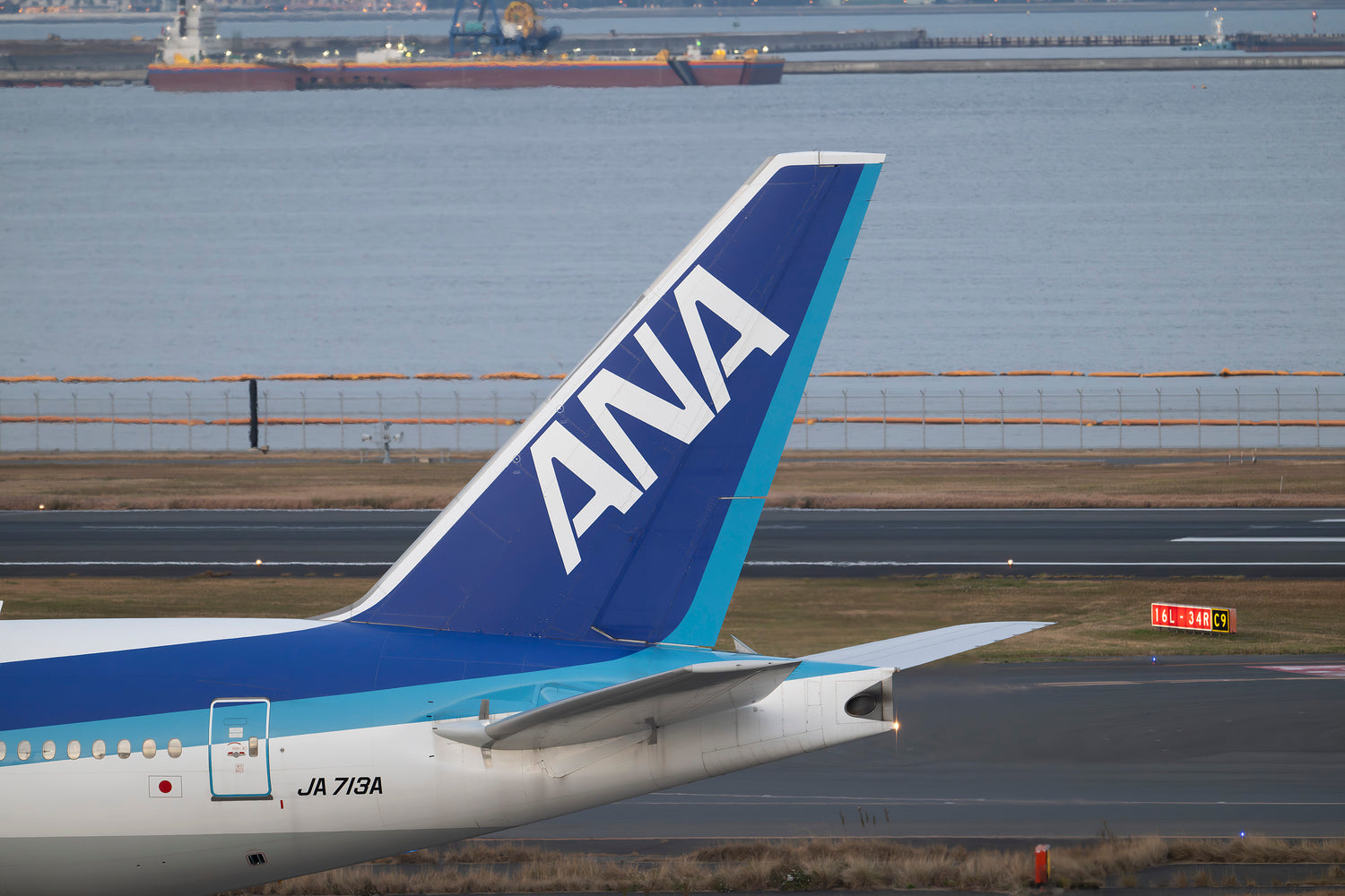 1994年に初飛行を行ったボーイングの大型旅客機777シリーズ。ANAでは国内幹線と国際線、JALでは国際線で活躍しています。展望デッキからもひと目で分かる大きな機体ですが、機体のディテールにもいくつかの特徴があります。まずは胴体最後部、補助エンジンの排気口部分が縦に切り落とされたような形状になっています。この他、メインギア(主脚)は左右6輪ずつの合計12輪なのも特徴です。