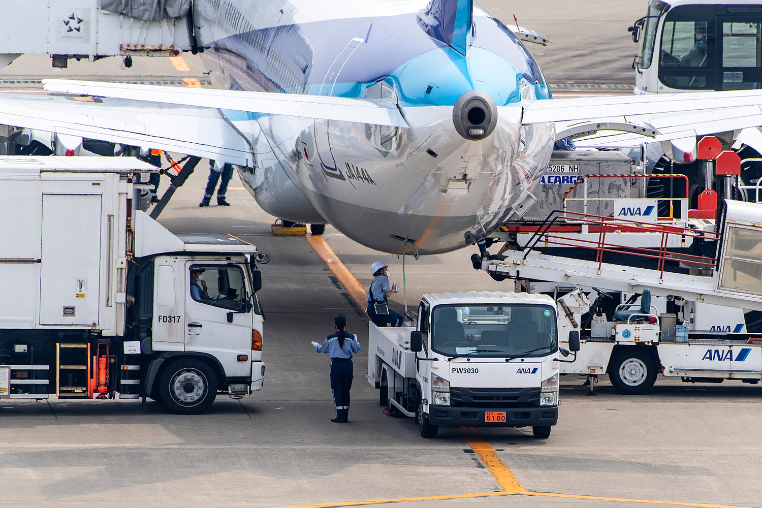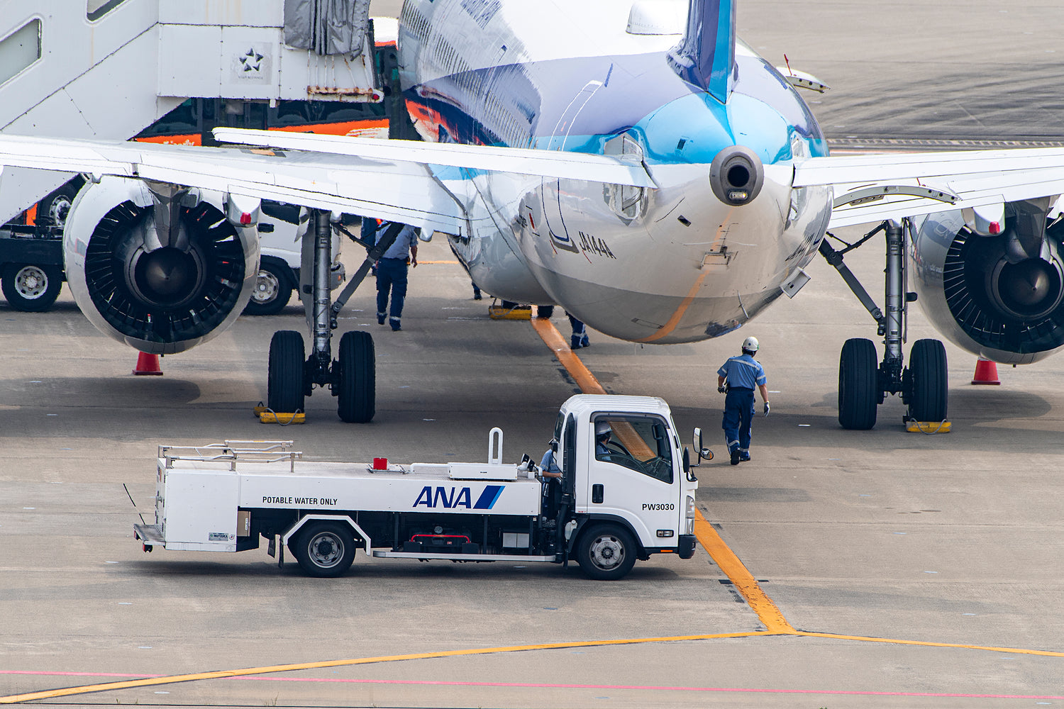 空港ランプ内を眺めていると、飛行機の運航を支えるべく、たくさんの“働く車”が使用されていることに気づきます。中には遠目には用途が分からない、シンプルなトラックが機体に接続されていることがあります。このトラックは機内で使用する「飲料水」などを運ぶための給水車で、必要に応じて新鮮な清水(キレイな水)を機体に補充しています。また、お手洗いなどで使用された水は汚水専用のラバトリーサービスカーが別途回収しており、衛生面もしっかりと保たれていますからご安心を!