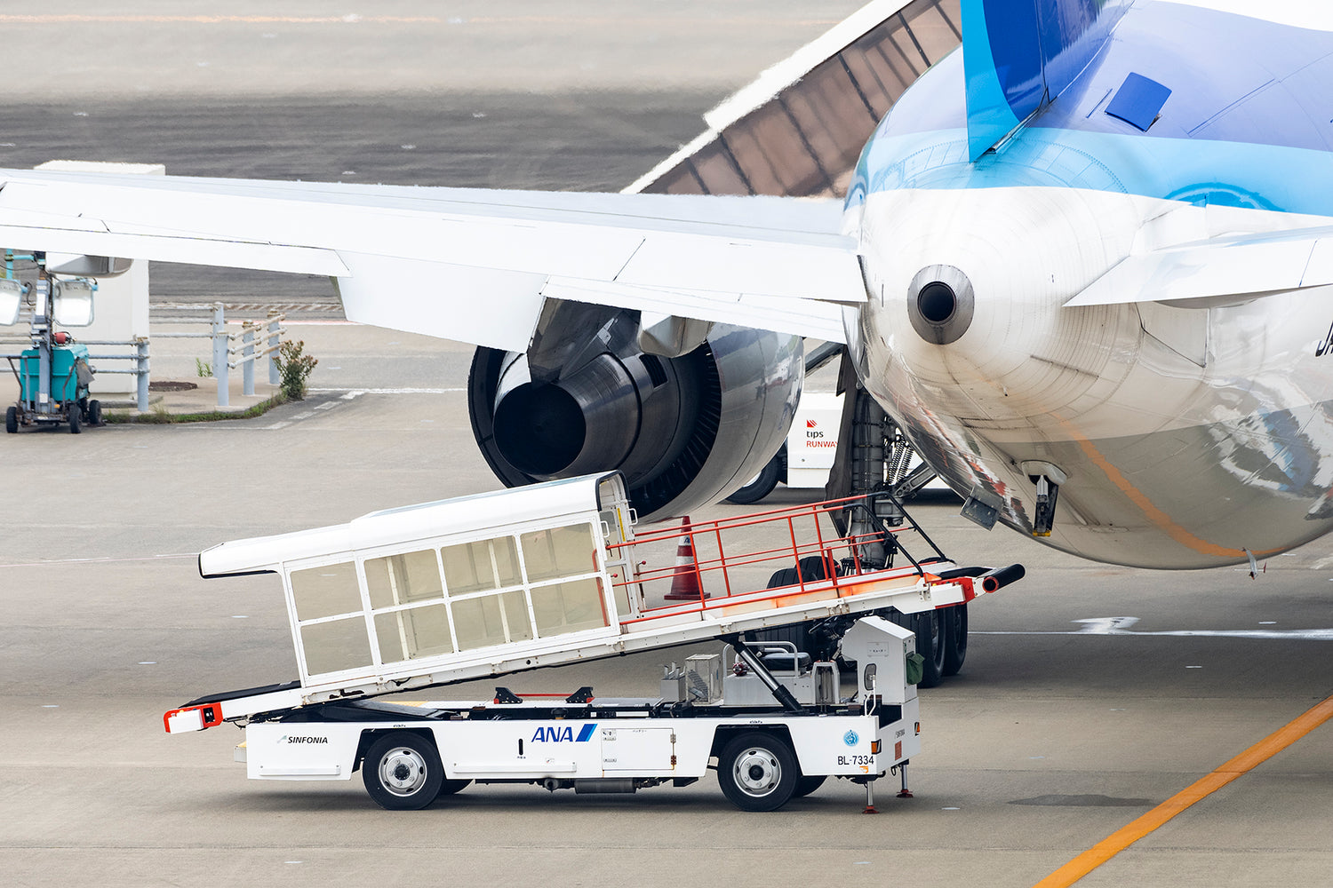 平らな車体に何やらすべり台のような装置がついたこのクルマ、『ベルトローダー』という旅客機の運航に欠かせない地上支援車両なのです。旅客機の客室下には手荷物や貨物を乗せる貨物室があります。この貨物室は専用のコンテナを使用する部屋と、バルクカーゴルームと呼ばれるバラ積みで搭載する部屋があります。このベルトローダーはバルクカーゴルームに荷物を運んだり、降ろしたりするための車輛で、すべり台のように見える部分はベルトコンベアになっています。
