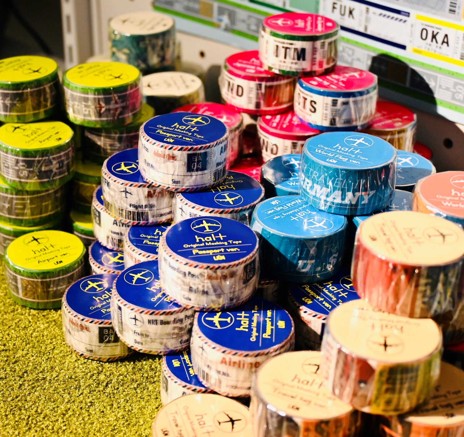 レトロな8bitのゲーム画面のようなドット絵デザイン+滑走路を走る飛行機のデザインの「hal+ オリジナルマスキングテープ Airport ver」が購入できるのはラグジュアリーフライト。マスキングテープはそのほかにも、世界5都市の空港がデザインされており、鞄につけるタグがモチーフのものや国内主要6空港のロゴがポイントとなったもの、世界地図に航路がデザインされたものなどがあります。