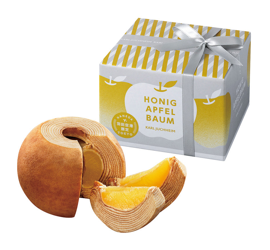 「ユーハイム」は1919年、広島で日本初のバウムクーヘンを焼きあげましたドイツ人菓子職人、カール・ユーハイムが会社名の由来となっている洋菓子店です。現在はバウムクーヘン以外にも、ドイツ菓子をベースにしたお菓子を多数販売し、全国300店舗以上で展開しています。大人気のバウムクーヘンの羽田空港限定商品が「ホーニッヒアッフェルバウム」。こちらはりんごのシロップ煮をバウムクーヘンで包み込んで1層1層丁寧に焼きあげたもの。はちみつ=(独:ホーニッヒ)を加えた生地は、ユーハイムのバウムクーヘンの中でも羽田空港だけのオリジナルです。羽田空港公式オンラインストア「HANEDA Shopping」でも購入できます。