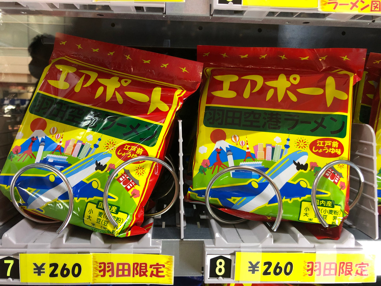 旅行はもちろん、飛行機見学で羽田を訪れたとき「なにか羽田オリジナルのお土産ってないかな?できれば、手軽に買えるといいんだけど…」と思ったことはありませんか? お土産店もたくさんある羽田空港ではさまざまな限定商品がありますが、羽田空港オリジナルにこだわるなら「エアポート羽田ラーメン」はいかがでしょう。昔ながらの豚ガラしょうゆ味のインスタントラーメンでお値段はなんと260円(税込)! レトロなパッケージと素朴な味はお土産にもピッタリです。空港内の「日本全国インスタントラーメン大集合!」自動販売機で購入できますので、お出掛けの際はおひとつどうぞ! ちなみに具は乾燥ねぎオンリーのシンプル仕様なので、お好きな具を添えてお楽しみください。