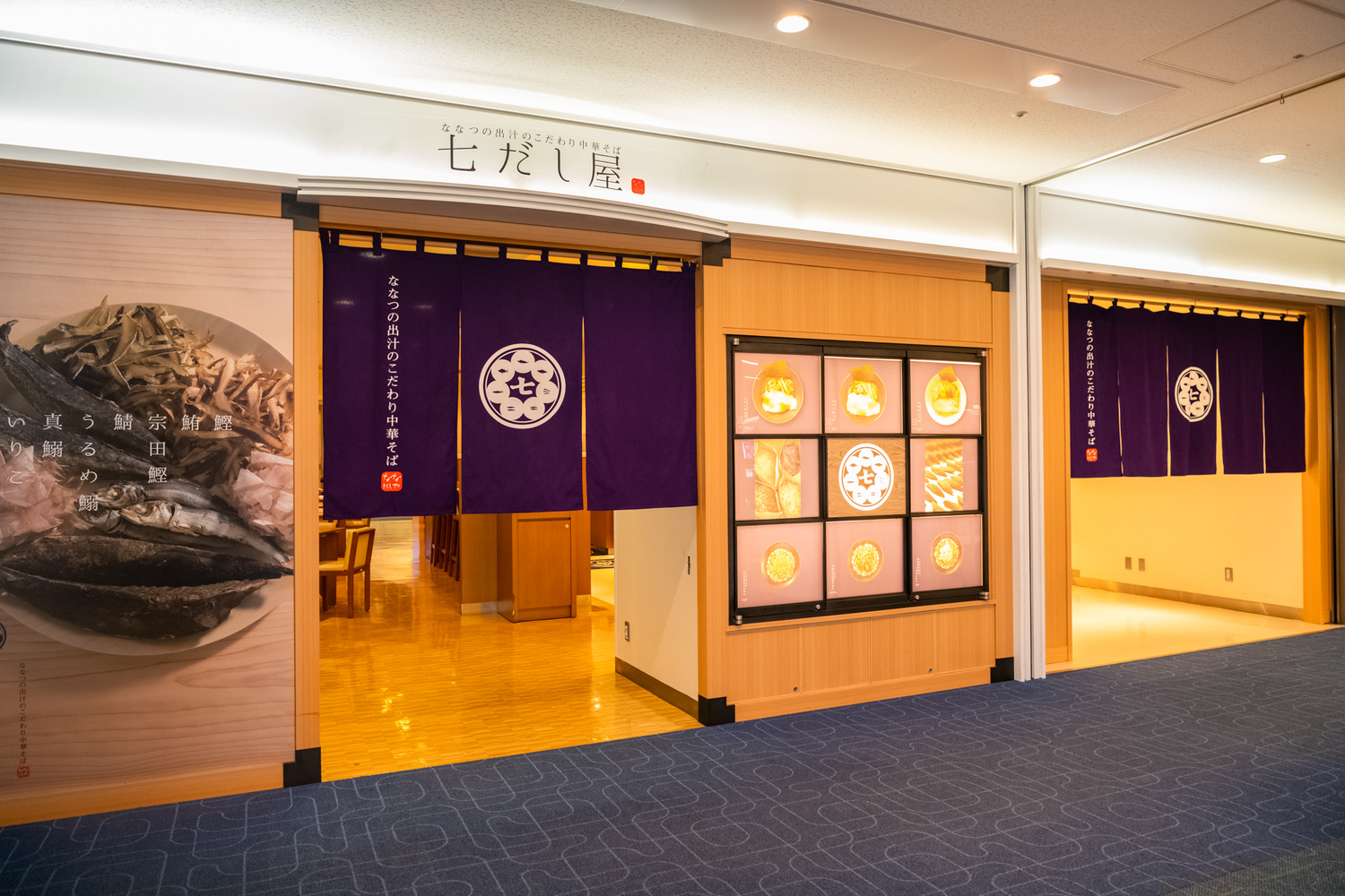七だし屋は、2018年9月5日に日本空港ビルデング株式会社のグループ会社である東京エアポートレストラン株式会社が、羽田空港第1ターミナル出発ゲートラウンジ内北ウイングにオープンした中華そば専門店です。店名にもなっている「七だし」とは、ベースとなる出汁のことで、「鰹」「鮪」「宗田鰹」「鯖」「うるめ鰯」「真鰯」「いりこ」の七種の節を使用しています。麺は全粒粉をブレンドした多加水麺で、モチモチとした食感が特徴です。麺の種類は醤油、塩、和えそばの3種類があります。