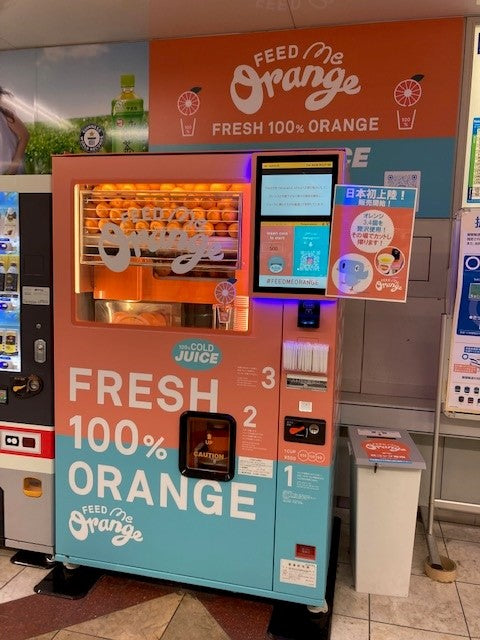 Feed ME Orangeは、1杯に3〜4個の生のオレンジをまるごと使用しています。オレンジを搾ったままの添加物などが一切入っていない果汁のため、混じり気のないオレンジ本来の香り高く濃厚な味わいを楽しめると大人気の自販機。また、マシンがオレンジを自動でカット、プレス、搾汁してカップに注ぐまでの約40秒の工程を見ることができます。