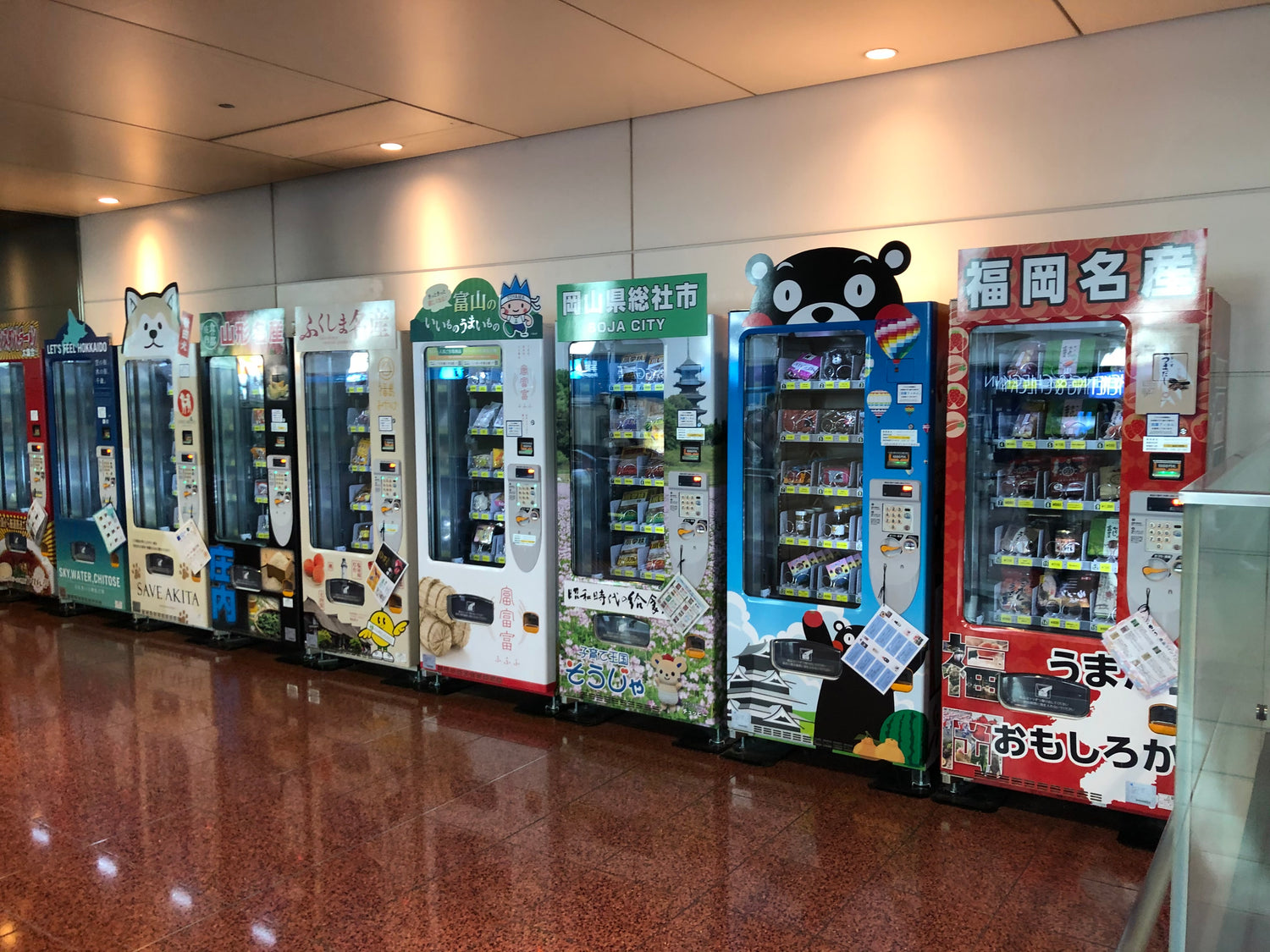 ご当地自動販売機は第2ターミナル2F出発ロビーにずらりと並んでいます。富山県の自動販売機では富山米「富富富」やケロリン湯桶ストラップ、かまぼこチップス、白えび、富山ラーメン、しろえびカレー、日本酒キットカットなどが販売されています。ご当地自動販売機は他にも、山形県、福島県、岡山県総社市、熊本県、福岡県、秋田県、北海道があります。