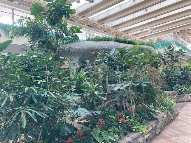 2012年3月9日に完成した、羽田空港第1ターミナル出発ゲート内にある屋内庭園「花の楽園-緑の詩をきかせたくて」。約150㎡の空間にシルクジャスミン、ベンジャミン、ガジュマル、タイワンモミジ、フランスゴムなど、約75種類約900本の樹木を植えられています。石原和幸氏は2011年3月の東日本大震災後に被災地を巡り、「美しい日本の原風景や自然と共に生きる心を世界中の人々に伝えたい」という思いから、英国「チェルシーフラワーショー」に出展。その作品を羽田空港内に再現しました。