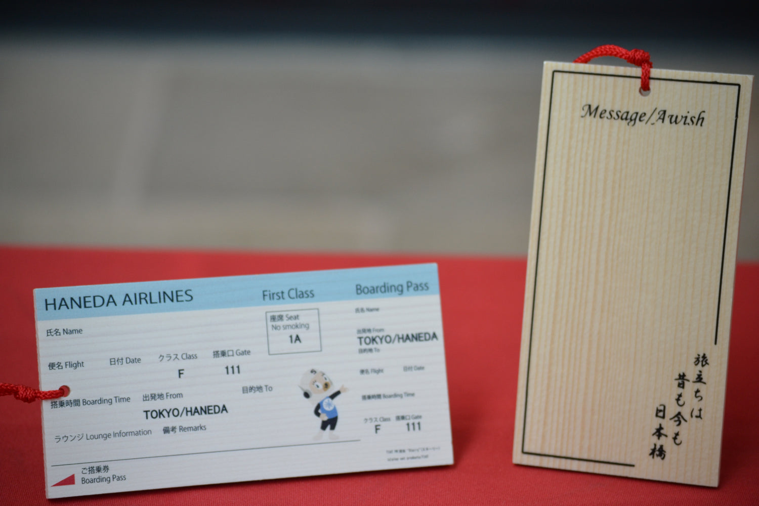 この木札はファーストクラスのチケットを模したデザインとなっており、裏には「旅立ちは昔も今も日本橋」の川柳が印字されています。この木札は絵馬の役割もあり、自販機の隣に設置された机にはペンなどが置かれ、願い事を記入することができます。願い事が書かれた絵馬は、「お祭り広場」と呼ばれる広いスペースの壁に掛けられます。旅に向かう前に、羽田空港を訪れた記念に、ぜひ願いごとを書いて飾ってみてください。