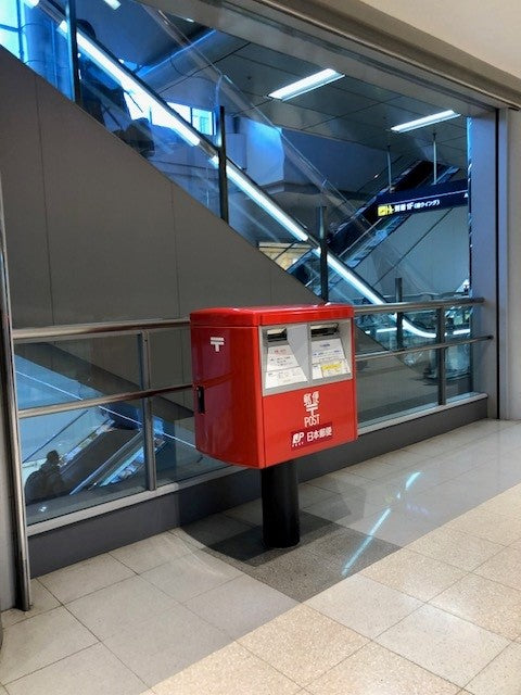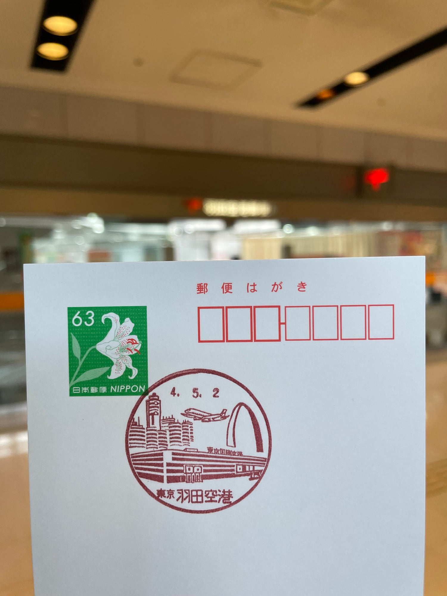 第1ターミナルの1階に1つ、2階に2つ、第2ターミナルの1階に1つ、2階に2つ、第3ターミナルの1階エントランスプラザに1つ、3階の出発ロビーに1つと、羽田空港では合計8カ所に郵便ポストが設置されています。郵便局は第1ターミナルにあり、飛行機や管制塔、ターミナルにスカイアーチを配した羽田空港郵便局限定の風景印が押されます。なお、郵便ポストはゲートラウンジ内にはありません。