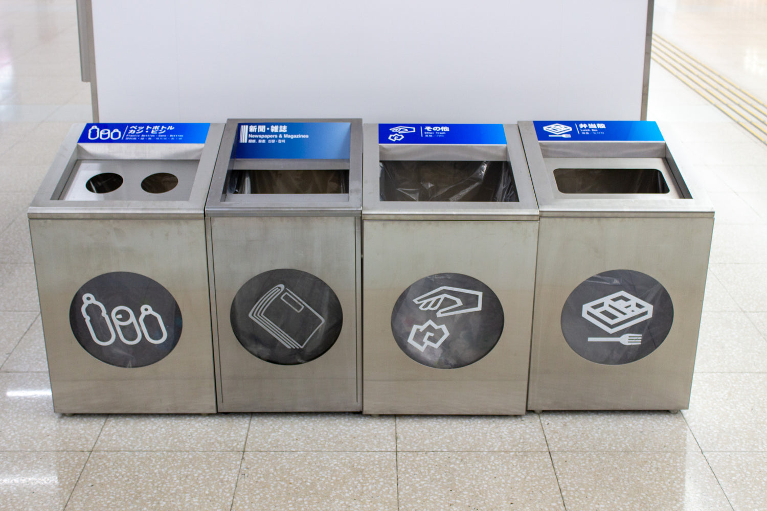 資源リサイクルのためにも欠かせない「ゴミの分別」。羽田空港では「ペットボトル・カン・ビン」、「新聞・雑誌」、「その他」のほか、一部には「弁当箱」用のゴミ箱も設置されています。また、国内外から多くの利用者が訪れるので、日本語のほか、英語・中国語、韓国語で分別が表示されるほか、イラストも描かれています。出発の待ち時間に空弁などを食べる方も多いと思いますが、食べ終わったゴミはゴミ箱に捨てましょう。