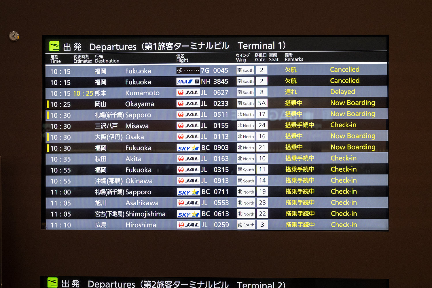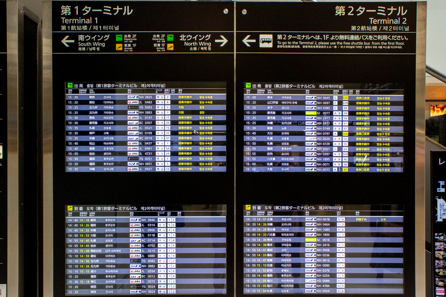 羽田空港のターミナルビル内には、飛行機の出発や到着を知らせる案内板が設置されています。航空会社はおもに利用者を対象としており、チェックインカウンターや保安検査場などに設置されています。空港が設置する案内板は、空港を利用される多くの方に見ていただけるよう、第1・第2ターミナルとも地下1階の案内カウンター近くに設置してあります。表示される項目ですが、出発の場合は時刻、行き先、便名、近くの保安検査場入口、空席状況、備考は、ともに共通です。一方で、航空会社の案内板は自社便とコードシェア便の搭乗口までの移動方法などが表示され、空港の案内板では時刻表にもとづいて、出発する航空会社すべてが表示されます。羽田空港のwebサイトでも出発・到着のご案内を表示していますので、ご旅行はもちろん、お見送りやお迎えで空港にお越しの際はチェックしてくださいね。