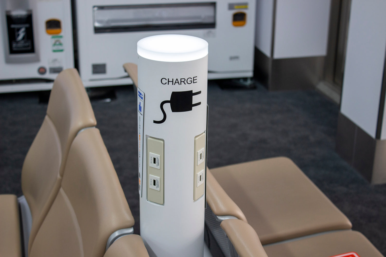 羽田空港内には至る所にスマホやPCが充電できる設備が設置されています。特にゲートラウンジ内には携帯電話充電スタンドが多く並んでいます。このスタンドの下には蓄電池が内蔵されており、もし停電した場合でも充電できるように備えてあります。その数約2万台分。1カ所に搭載するUSBポート(8ポート)に対し、約200人(1人当たり30分間)が順次使用する想定で計算しています。