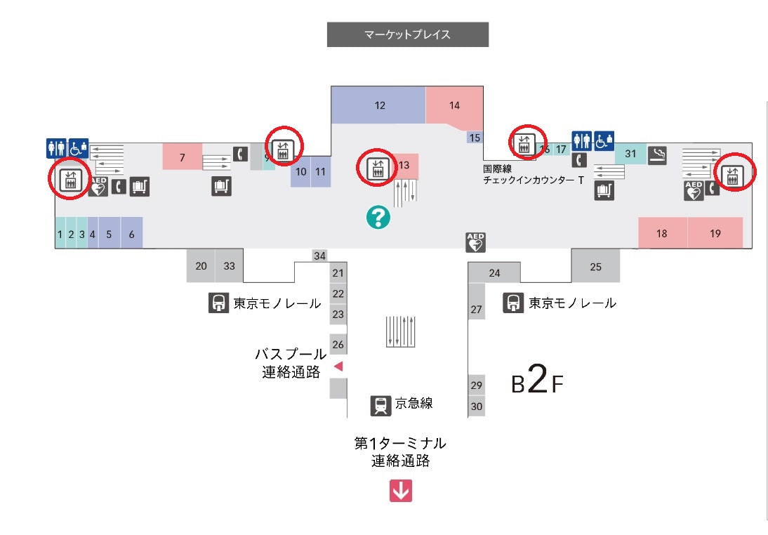 地下1階の中央、案内カウンターの後ろにエスカレーターもありますが、荷物も多いし…そんな時は地下1階の南北にあるエレベーターを利用してみては? 北側はANA FESTAの横と手荷物預かり所の向かいの2ヶ所、南側は銀行ATMコーナー横と丸亀製麺の奥の2ヶ所、そして中央の吹き抜け部分にもエレベーターがあるので、大きな荷物があっても安心して出発ロビーまで直行できますよ。