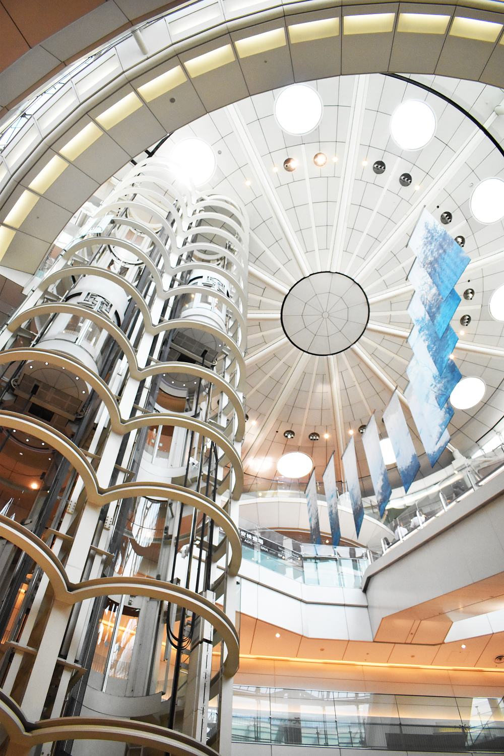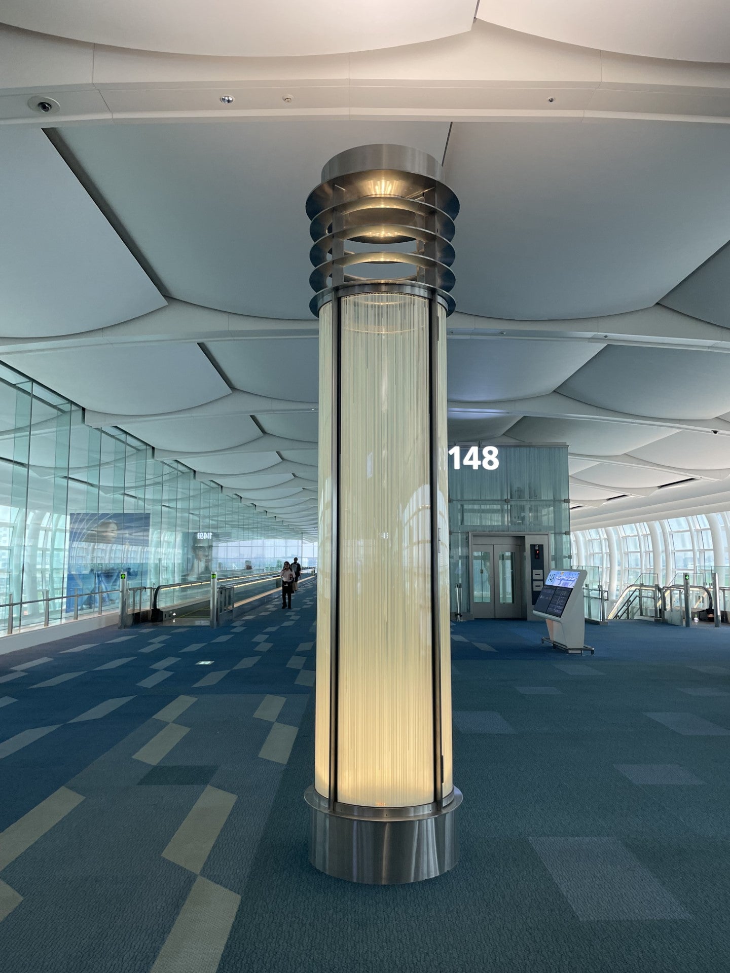 第2ターミナルのマーケットプレイスには巨大な和紙に描かれたアート作品は、芸術家千住博さんの『滝のオーロラ / AURORA OF WATERFALL』です。この明るい巨大な吹抜け空間に吊るされた作品は、下から見上げるとオーロラのように、階を上がることに滝のように見えます。第2ターミナルにお越しの際には、ぜひ注目してみてください。