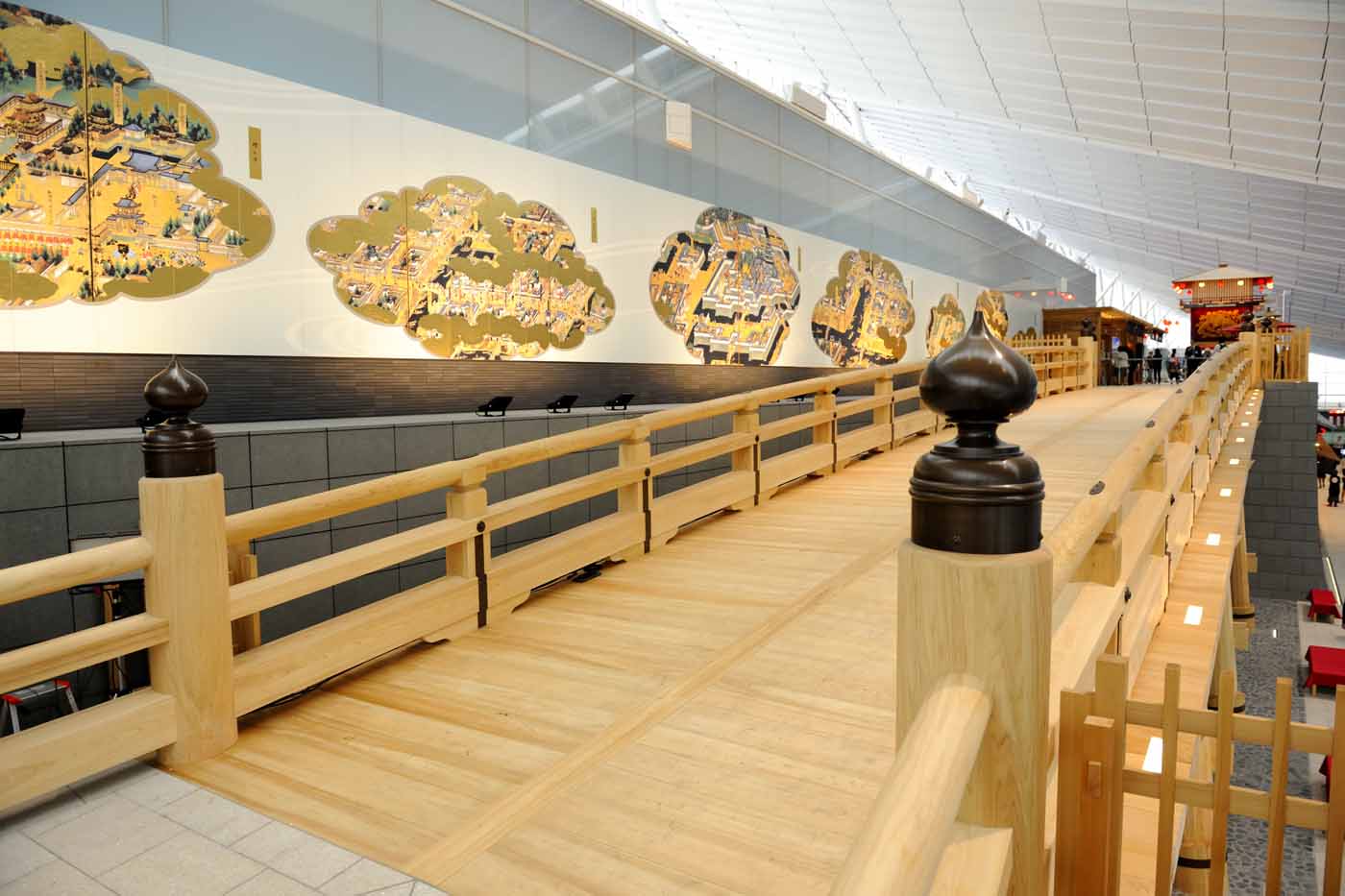 江戸時代の五街道の旅の起点であった「日本橋」。それを模した「はねだ日本橋」は現代の空の旅の出発点として第3ターミナルに設置されました。この橋は吉野産の総檜造りで、幅・長さとも当時の日本橋のおよそ半分のサイズで復元されています。また、壁面には「江戸図屏風」より各名所を取り上げ、江戸の町の賑わう様子を陶板壁画にて表現されています。江戸時代初期の江戸市街地および近郊の景観を画題として描かれ、まるでタイムスリップしたかのような感覚を味わえます。